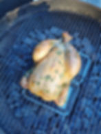 Pour notre volaille, l’idéal est donc de cuire avec un feu indirect en forme d’anneau ou de rectangle suivant la forme de votre barbecue. L’idée est de mettre une barquette d’aluminium au centre du foyer pour récupérer le jus de cuisson. Le foyer en anneau agira vraiment comme un four traditionnel et la chaleur viendra entourer votre poulet pour le cuire uniformément. Attention, j’utilise un barbecue à couvercle de type Weber pour cette cuisson. J’ignore si cela fonctionne sur d’autres types de barbecue. Mais j’obtiens ainsi une chaleur uniforme de l’ordre de 200°C.